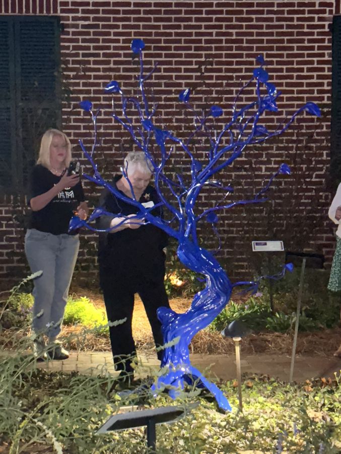 Attendees then transitioned to the garden for the rededication and enjoyed food and beverages in the garden and the museum. A blue Melmac tree sculpture was also “planted” in the garden in Ms. Owen’s honor. The sculpture has 20 leaves, one for each year that she has been chair of the literary garden.