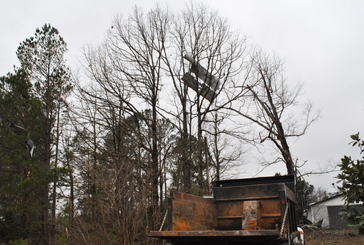 MDOT still had a section of Hwy. 9 just north of Alpine closed as they cleaned up debris and parts of County Road 172 and others in the area were intermittently blocked as Union County crews loaded fallen trees into dump trucks.