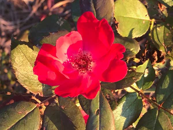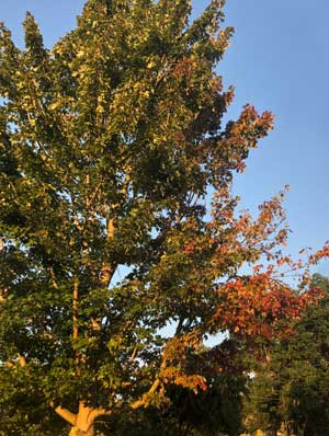 The red maple leaves are on a single tree, which we have been observing since it was planted about ten years ago. Toward the end of August of each year, a small patch of leaves on this particular tree turn bright red, while the rest of the leaves stay green until late in September.