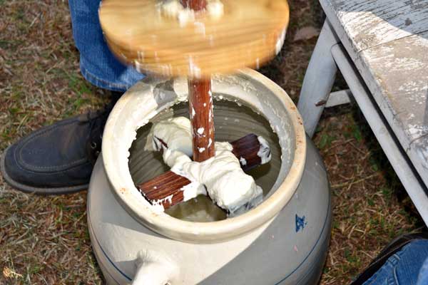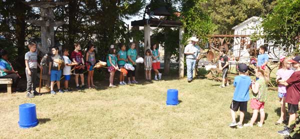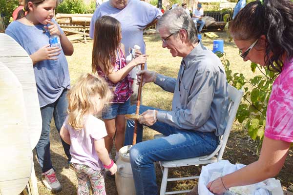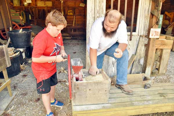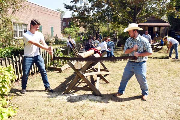 Events planned over three days, Thursday – Saturday, Oct. 3 – 5, drew children and adults to practice hands-on skills from historic days. Churning butter by hand in a stone crock; washing clothes with a hand-cranked wringer to squeeze out the water; shelling and grinding corn; cutting logs with a two-person cross-cut saw — were just some of the activities in which visitors actively participated.