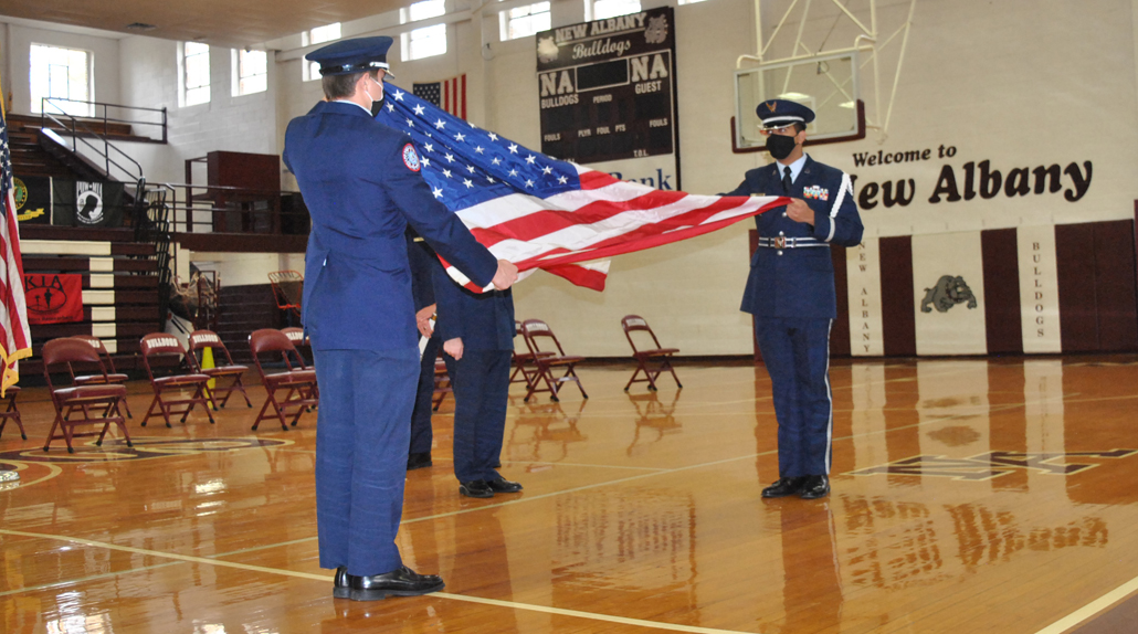 Veterans who were present were asked to stand and be recognized by the branch of the military they served in. The New Albany High School Junior ROTC performed the US flag-folding ceremony with narration about the meaning of each fold and Annsley Coleman explained the symbolism of the Prisoner of War-Missing in Action table.