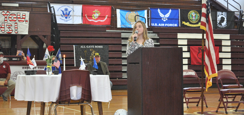 Landry Kent talked about Veterans Day, the school advanced singers performed the National Anthem, a group of sixth- through eighth-graders recited a veterans poem and a special trio sang “My County ‘Tis of Thee.” Principal Paul Henry welcomed everyone and moderated the program.
