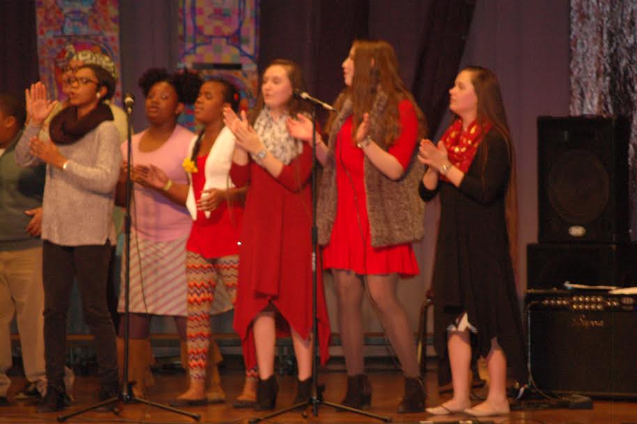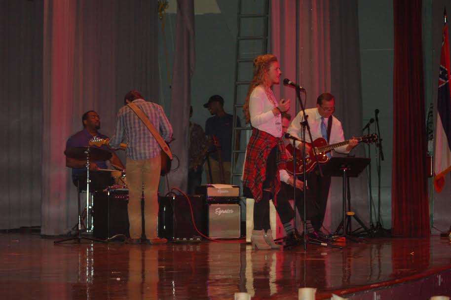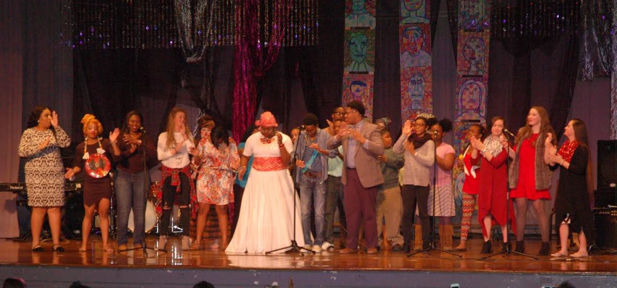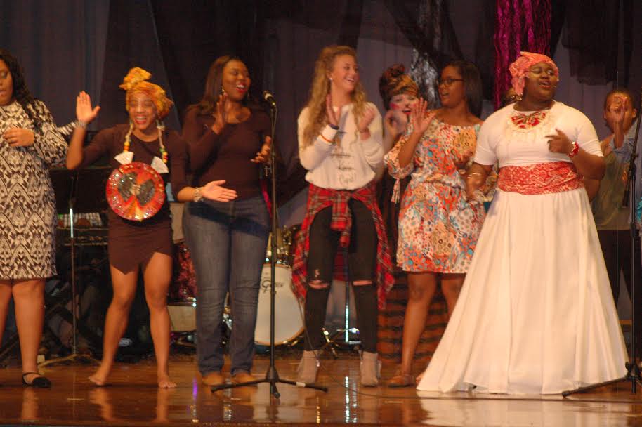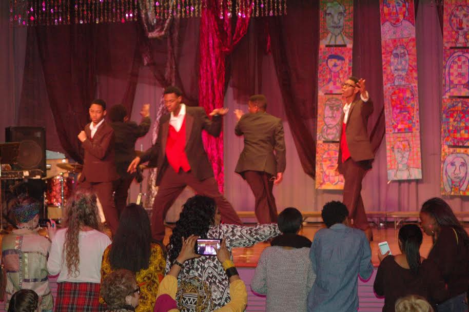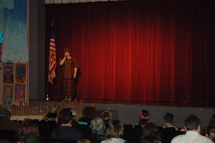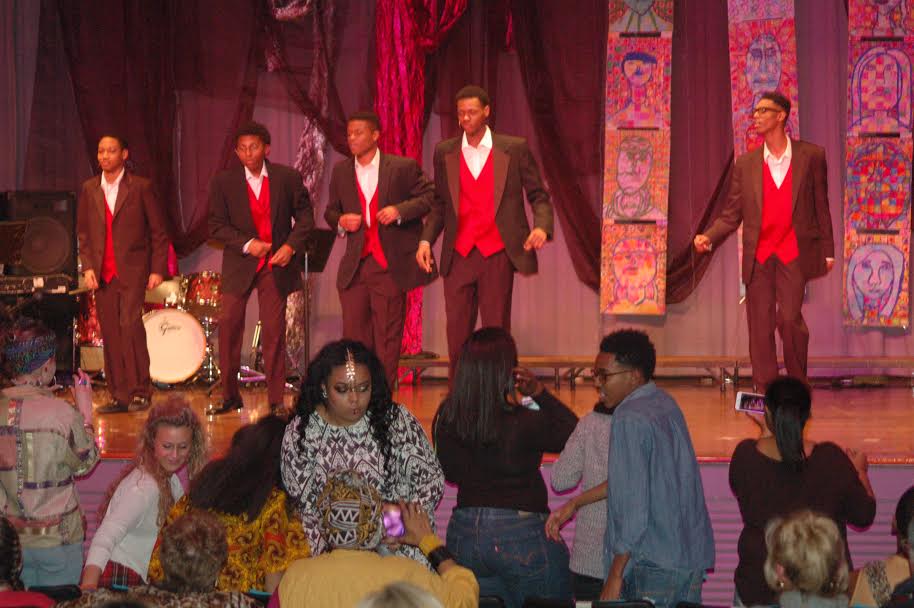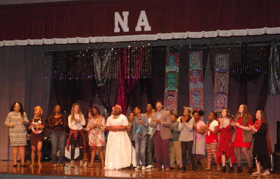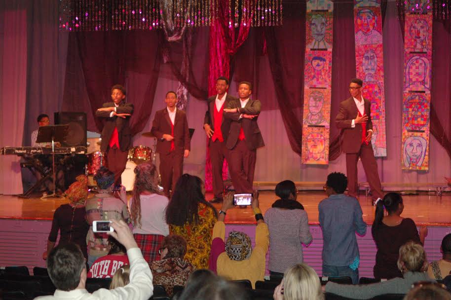 At the New Albany High School Auditorium tonight, the “Moving Forward, GIving Back” event included patriotic presentation of colors, African folk music, pop music and oldies, as well as readings and African-inspired fashion. A sampling of the evening’s entertainment may be seen in the slide show below.