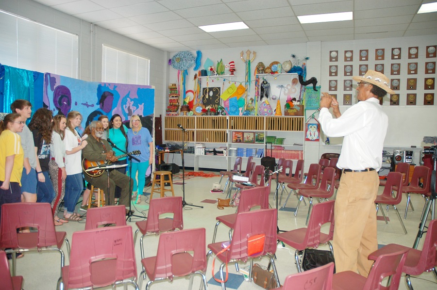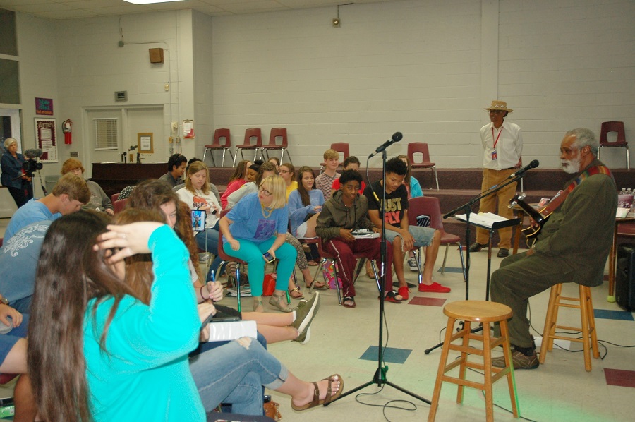 The performing arts and choral music classes of Mary Beth Muncie at New Albany High School are wrapping up a unit of study on American music this week. To conclude their studies they invited local blues artist Sam Mosley to speak and perform for the morning. While he spoke and performed for each class, one class in particular got in on the action and sang with Sam and ended the class with a dancing rendition of “Slide On”. Several art classes were able to be a part of the morning due to their study of the blues this fall. Some of the students have even created a Twitter account @SamMosleyFans where they encourage locals to post pictures of their Sam Mosley “sightings”. The event was filmed by the journalism class and was live streamed . That video can be found on Facebook on the In the Dawghouse page.—Lee Thompson