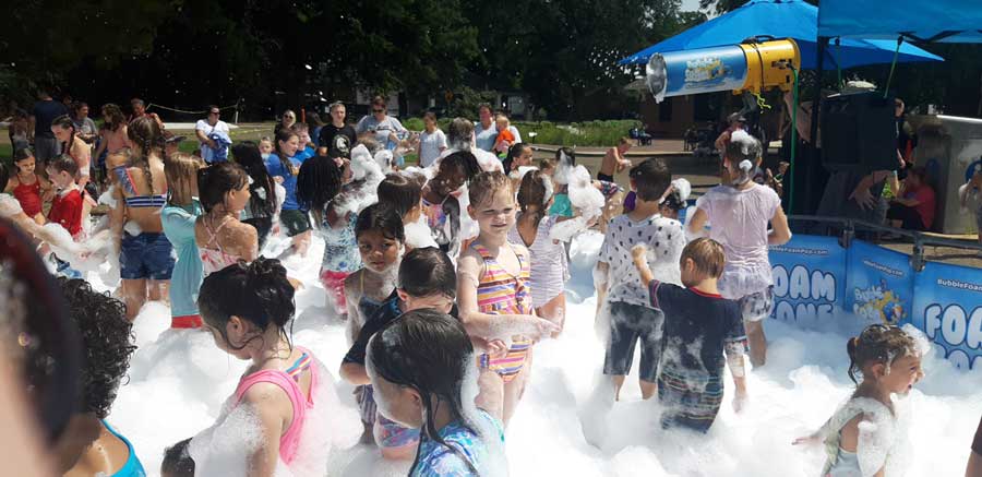 Firemen used a foam machine which created a small mountain of cooling suds that chilled the kids down in the 90-degree July heat