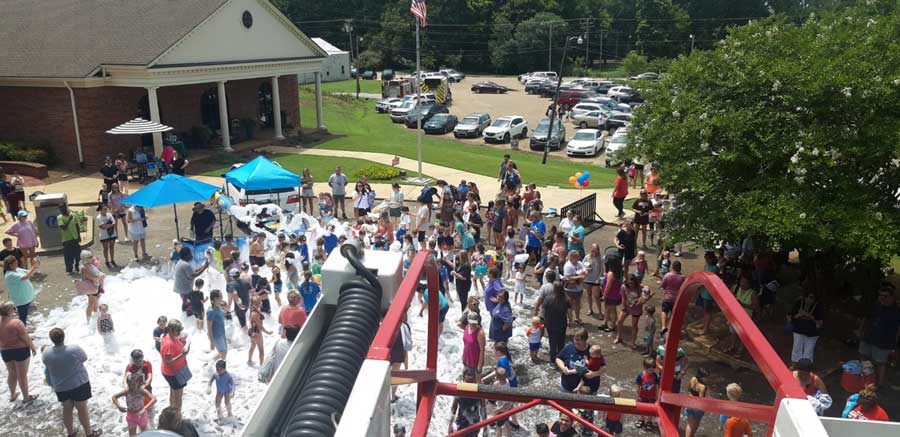 The New Albany Fire Department (NAFD) treated children to a spray, foam and bubbles party yesterday at the Union County Library in New Albany. Using an NAFD ladder truck, firemen hooked a spray hose high on the ladder and sent a wide spray of water onto the children below. The library provided a special foam machine for the event.
