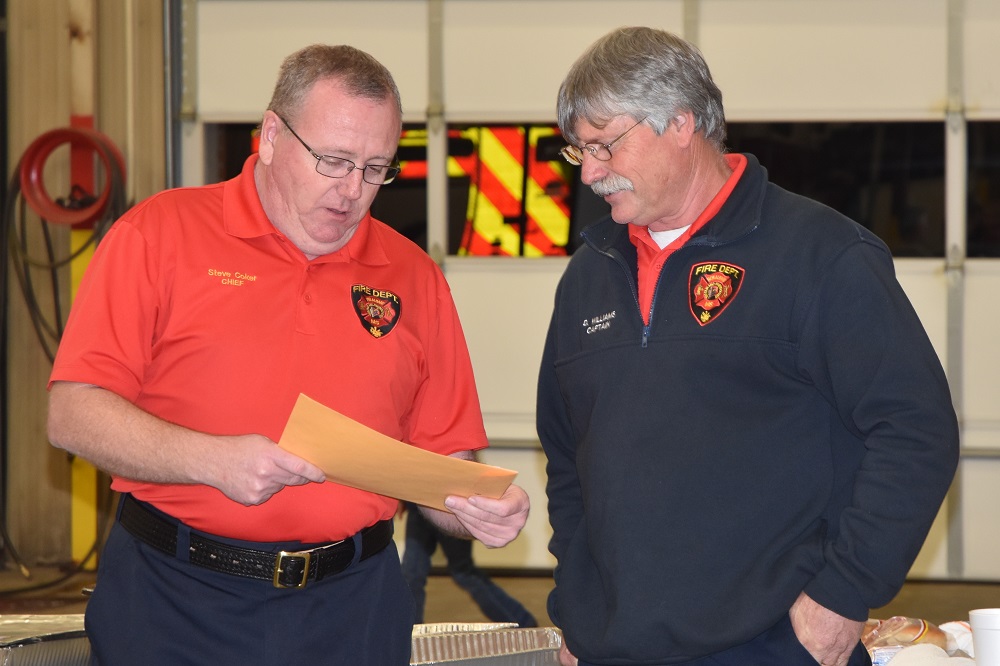 Chief Steve Coker awarding Captain Mark Sides with both his 20 year service award, and 2016 Fire Fighter of the year award.