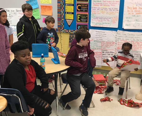 Students in some fourth and fifth grade classes at New Albany Elementary School adopted students in Ms. Susan Kelly’s and Ms. Scherrita Tucker’s classes and provided gifts for them to open on December 18.