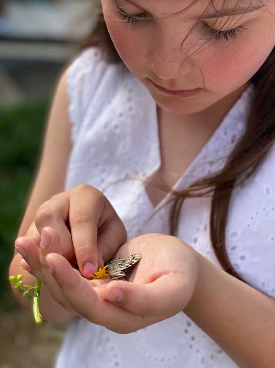 The finale of the May Day Tea was a butterfly release. Sherra Owen, a New Albany Garden Club member since 1978 who is passionate about the education of native plants, read Eric Carle’s THE VERY HUNGRY CATERPILLAR and followed with a discussion about pollinator plants that are vital to the survival of butterflies. Cassie Henson, who takes over as club President in September, organized the butterfly release shared, “Seventy-five Painted Lady butterflies were released by participating girls and ladies who chose to honor or release in memory of someone special.”