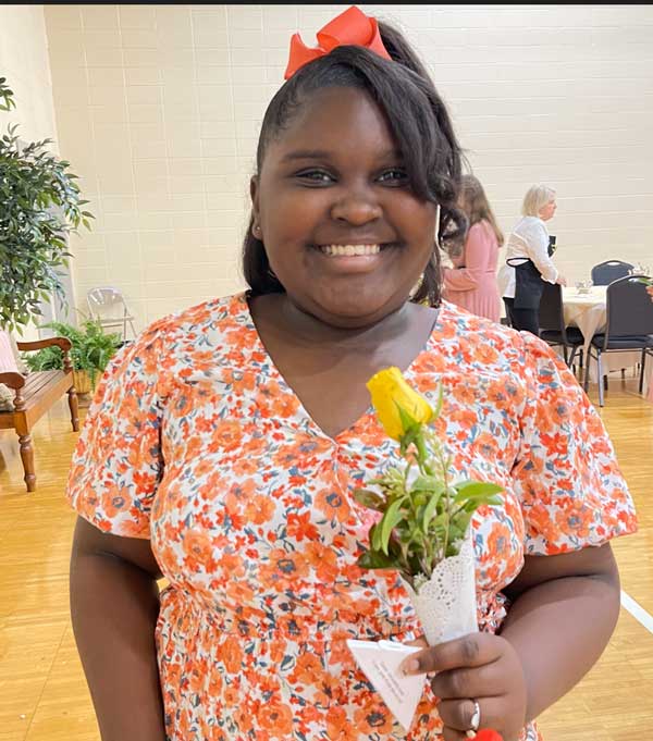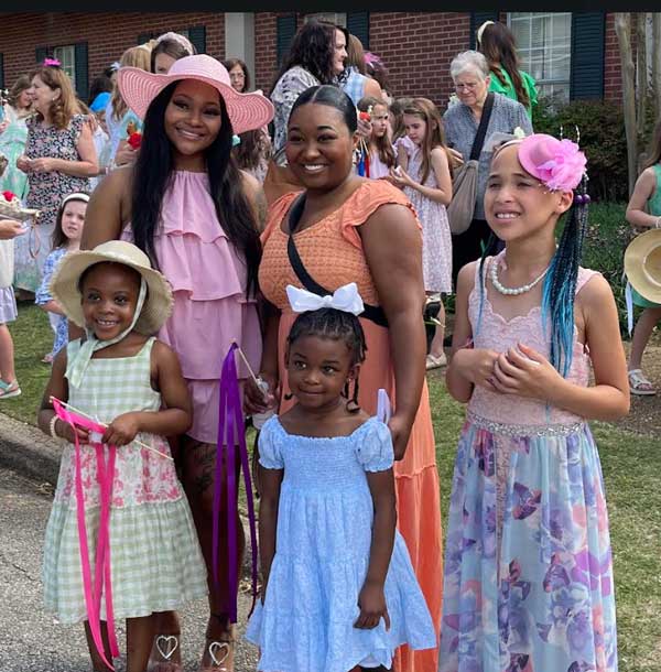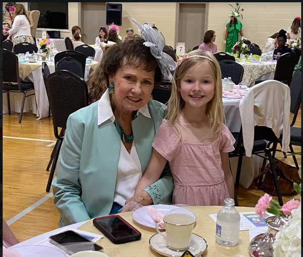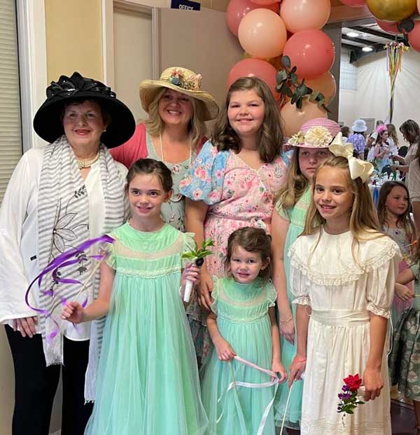 Over one hundred ladies and girls, dressed in spring outfits, some with fascinators, hats, and gloves, were greeted at First Baptist’s Family Life Center with tables covered in floor length tablecloths, layered with toppers and tulle and set with colorful arrangements, fine china sets of cups, saucers, creamers, and bowls stocked with sugar cubes. Every space was set up with special activities; photo stations, a caterpillar observation station, spring coloring pages, croquet, ribbons for dancing, and a 15-foot-tall maypole adorned with flowers and a rainbow of floor length satin ribbons.