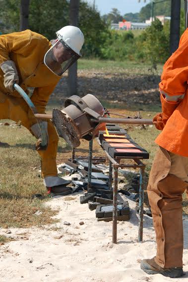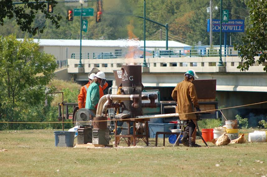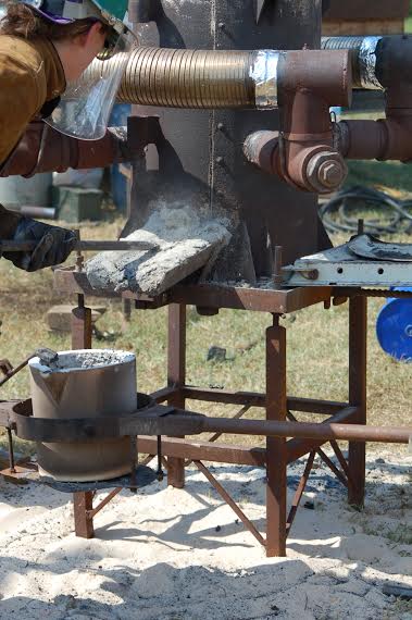 Saturday afternoon the foundrymen from Alabama combined coke with scrap iron in their small cupola furnace to melt the iron to its liquid temperature. An electric blower “blasted” extra oxygen into the fire to make it burn at the required high temperature.