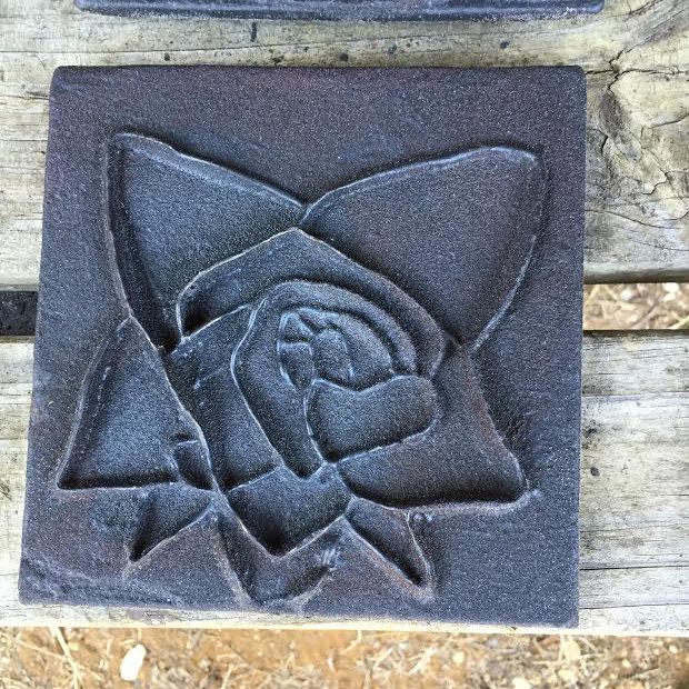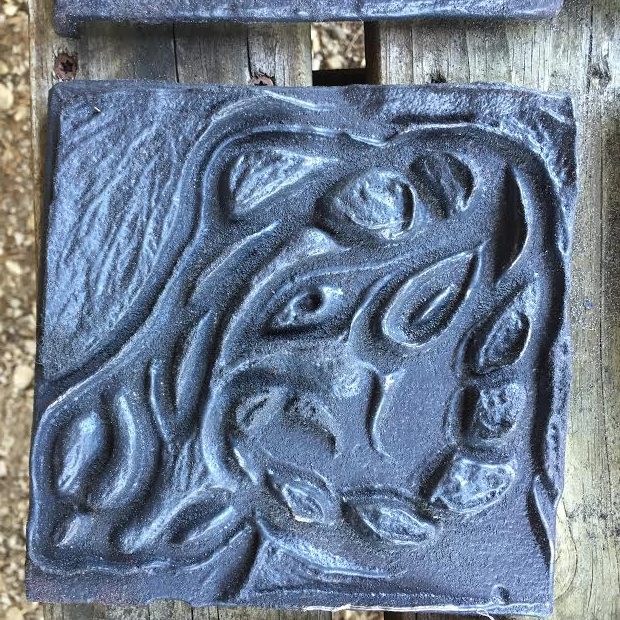 When the iron was melted, the foundrymen “tapped” the furnace and the stream of red/white iron flowed out at about 3,000 degrees F and into a small refractory-lined ladle handled by two workmen. The molten iron was then poured into 6 x 6 inch molds, formed from scratch blocks onto which designs had been carved by art students and other local people.