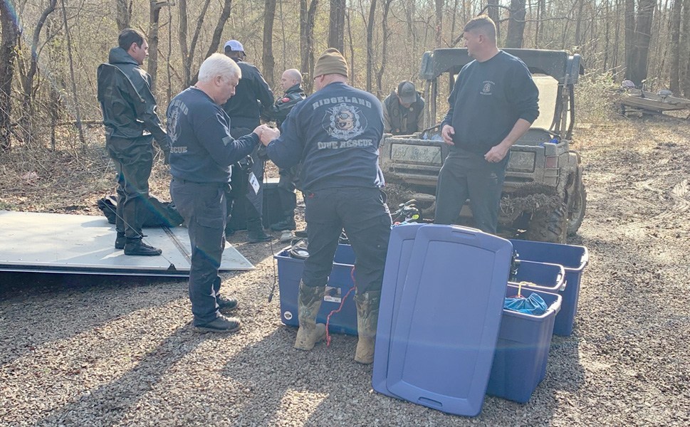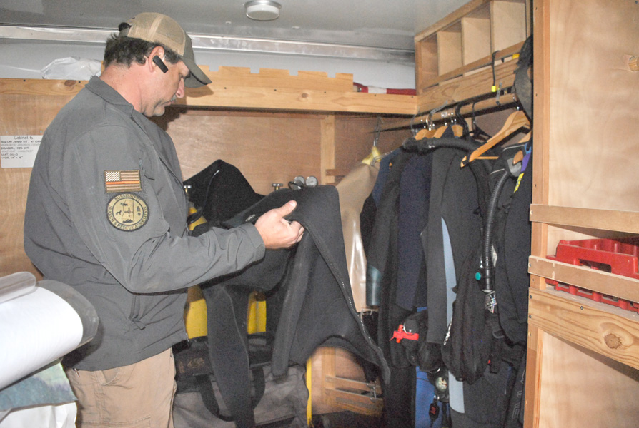For water searches, Clayton has a dive trailer to bring. In it are 10 diving wet suits plus air tanks, a compressor and various tools. “We hope to have six to eight dry suits soon,” he said. The dry suits are needed for cold weather and, at about $2,000 each, have full face masks and radio communications so divers can communicate with the surface and each other. Dive teams are sometimes brought into the area from other parts of the state as well.